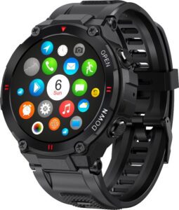 Deze robuuste smartwatch is ontworpen voor sport, avontuur én dagelijks gebruik, geschikt voor dames, heren én kinderen. Dankzij de grote kast van 45 mm, het 1,28″ display en de IP67 water- en stofdichtheid kun je hem probleemloos dragen bij allerlei omstandigheden. Hij meet je hartslag, slaapritme, stappen, calorieverbranding en biedt diverse sportmodi zodat je jouw vooruitgang eenvoudig bijhoudt.